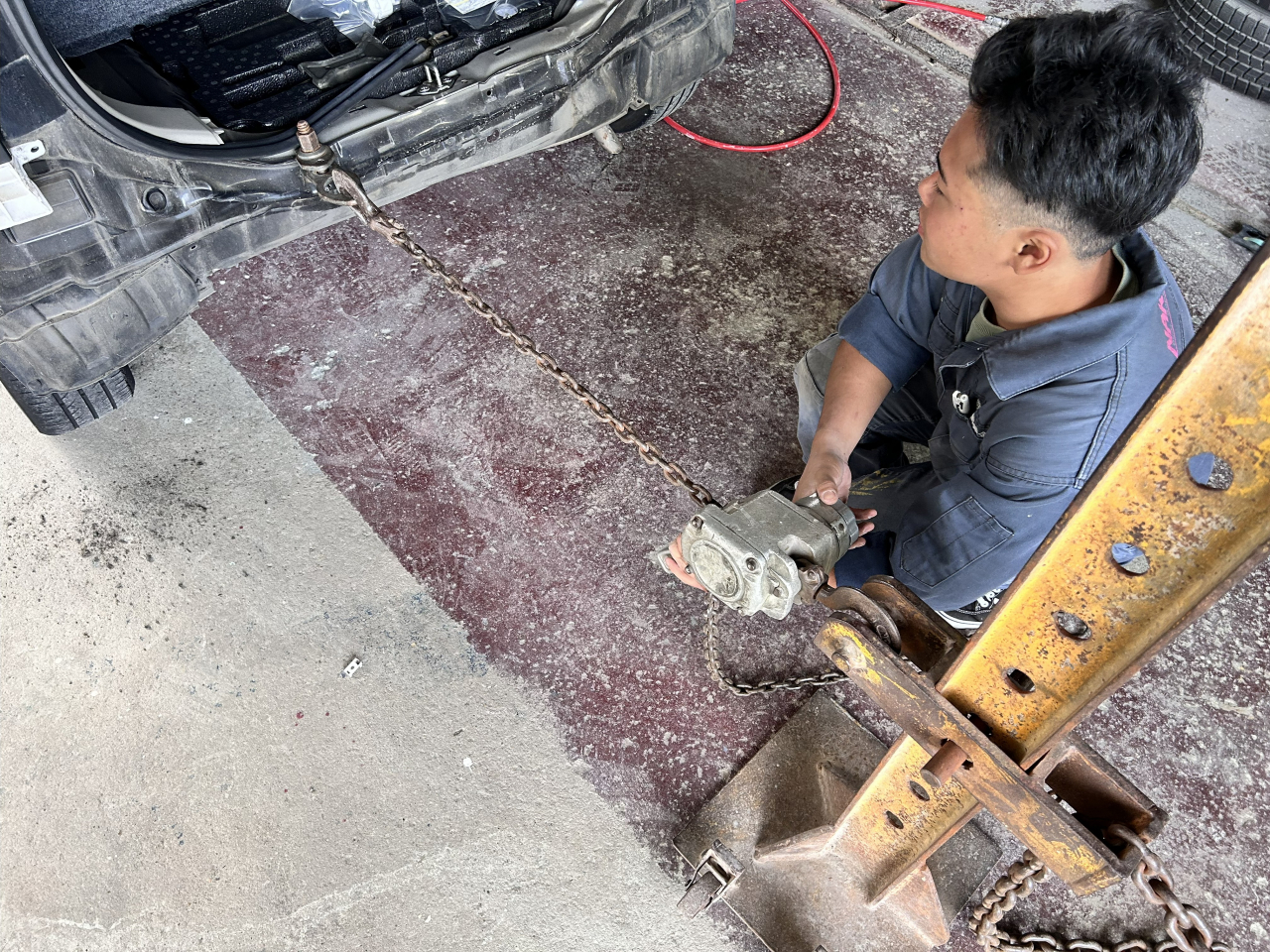 慎重に部品を取り外し、フレーム修正機や溶接機などの専用機器を用いて、歪んだ車の「骨格」やヘコんだボディー(鉄板)を、ミリ単位で元の状態に戻していきます。